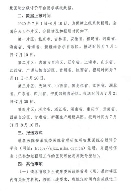 數據上報時間為2020年7月1日-8月10日。登錄醫院管理研究所智慧醫院分級評價平臺(http://sjzx.niha.org.cn)注冊報送,為保障上報系統暢通,全國分為4個片區,根據不同時間段報送。