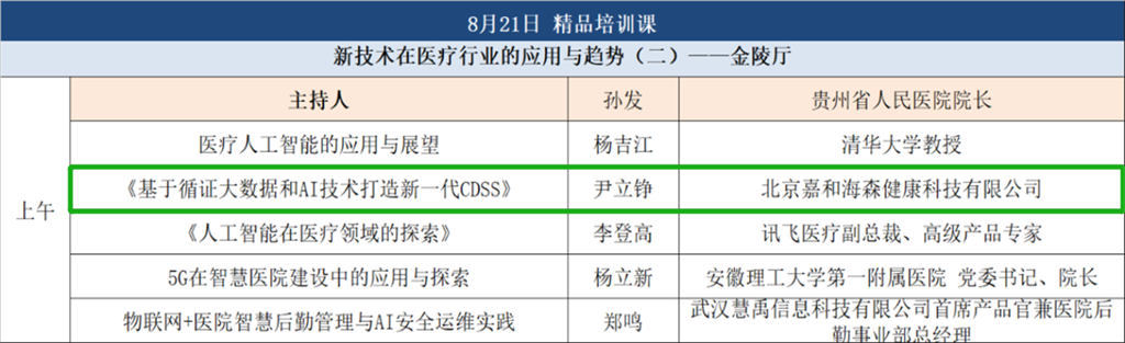 會議期間,嘉和海森健康大數據事業部醫療AI高級專家尹立錚將于8月21日“新技術在醫療行業的應用與趨勢”精品培訓課中以《基于循證大數據和AI技術打造新一代CDSS》為題,詳細闡述嘉和美康基于歷史病歷學習與循證醫學知識庫“雙引擎”的新一代CDSS技術與應用。