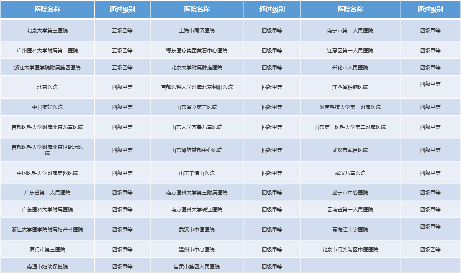 此次測評共涉及全國20個區域和148家醫院,在嘉和美康的產品及技術的支持下,有11家醫院參評并順利通過測評。其中,浙江大學醫學院附屬第四醫院通過五級乙等測評,興化市人民醫院、江西省腫瘤醫院、河南科技大學第一附屬醫院、山東第一醫科大學第二附屬醫院、武漢市武昌醫院、武漢兒童醫院、遂寧市中心醫院、云南省第一人民醫院、青海紅十字醫院通過四級甲等測評,北京市門頭溝區中醫醫院通過四級乙等測評(注:排名不分先后)。截至目前,嘉和美康已累計助力全國38家醫療機構通過互聯互通高級別測評,包括北京大學第三醫院(五級乙等)、廣州醫科大學附屬第二醫院(五級乙等)、浙江大學醫學院附屬第四醫院(五級乙等)。具體名單如下: