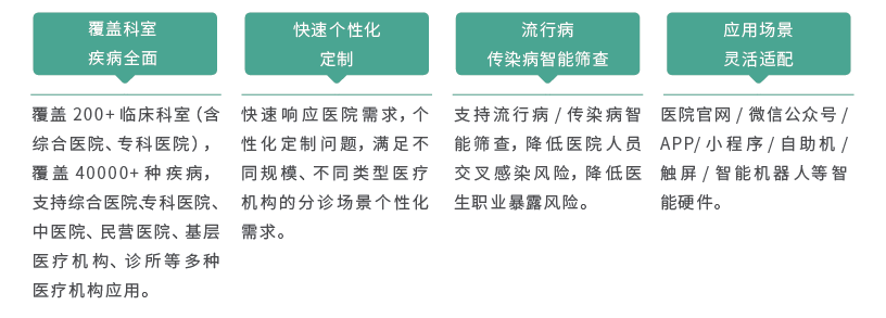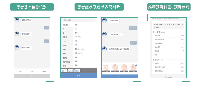 該系統是一套應用自然語言處理、機器學習等人工智能技術構建的交互式人機問答算法體系。該系統可在患者預約掛號前引導其輸入疾病相關信息,給出準確的科室推薦,有效調配醫療資源,實現醫療資源的有效利用,避免因掛錯號導致的病情延誤和醫療資源浪費,同時緩解醫院導診壓力,提升醫療服務質量和效率。