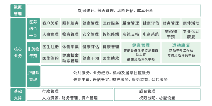 嘉和長期護理險綜合管理平臺是依托嘉和醫養結合養老管理系統,利用移動互聯技術為政府和經辦機構提供的一套全方位的包括經辦、服務和監管的統一平臺。長期護理險綜合管理平臺包括公共服務、業務經辦和機構及居家社區服務,與社保平臺對接,形成業務閉環服務。長期護理保險的參保與結算業務在社保平臺,失能申請、評估鑒定、照護服務、服務監管、公共服務在長期護理險綜合管理平臺。