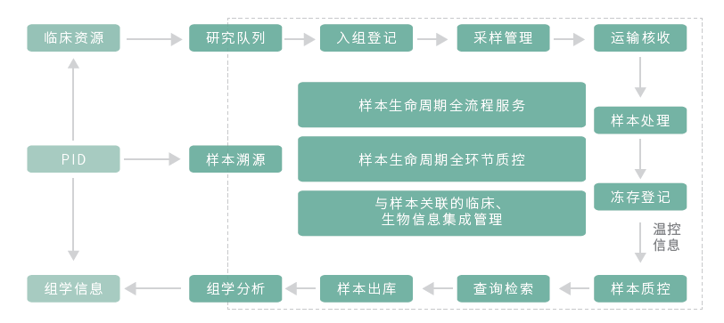 基于S O P,從研究對象登記、標本采集、標本送存、標本核收、標本處理、樣本入庫、樣本出庫等各個環節嚴格管控,形成完整的樣本全流程/ 全生命周期管理記錄。