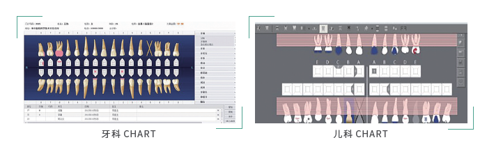 系統(tǒng)設(shè)計(jì)了針對(duì)不同科室的專科圖表(Char ting) 模塊,提供符合國(guó)際規(guī)范的標(biāo)注工具,可在圖形化界面中標(biāo)識(shí)檢查所見(jiàn)與治療操作,牙周檢查通過(guò)在牙周大表中快速填寫(xiě)全口牙周的各項(xiàng)指標(biāo),生成直觀的牙周顯示圖。在日期刻度中記錄不同看診次的專科圖表(Char ting),通過(guò)圖形化界面直觀的觀察到患者口腔檢查所見(jiàn)與治療進(jìn)度。